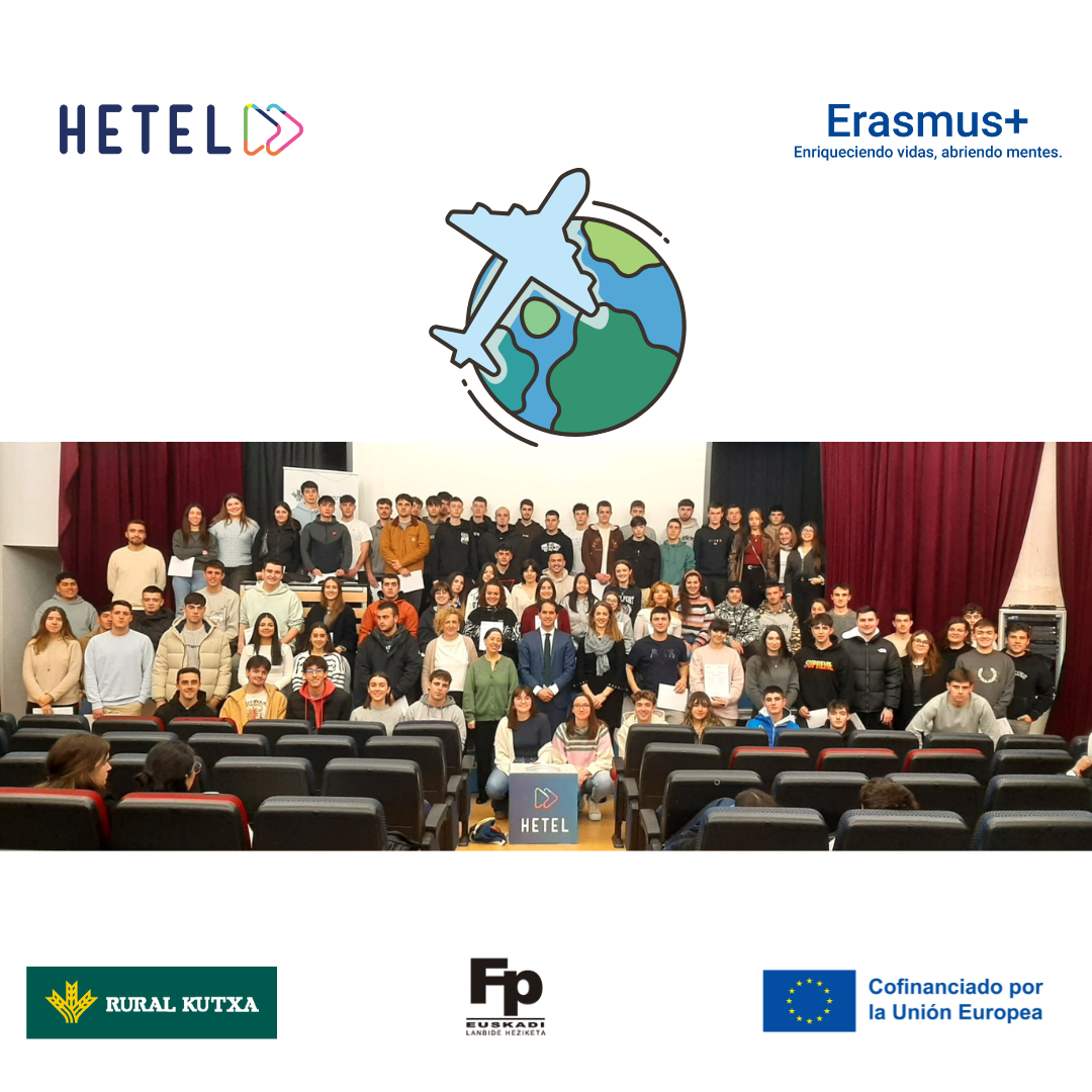 El 5 de febrero se han realizado las charlas dirigidas a los y las 145 alumnos y alumnas que realizarán sus prácticas en el extranjero gracias a una beca Erasmus+. Este miércoles se ha reunido al alumnado erasmus+ de grado medio y superior con el fin de ofrecerles recomendaciones generales sobre su experiencia en el extranjero, y, algunas indicaciones sobre la documentación a entregar.  Ya está todo listo para que los estudiantes hagan sus 13 semanas de prácticas en empresas de 6 países de Europa (Italia, Bulgaria, Portugal, Letonia, Malta y Polonia). Más adelante se repetirá la jornada con los y las estudiantes de FP de grado básico que realizarán una estancia de 4 semanas en mayo en empresas de Portugal. En este acto también han participado responsables de Rural Kutxa, ya que las becas de Erasmus+ de grado superior están financiadas por el SEPIE y cofinanciadas por el Departamento de Educación del Gobierno Vasco, cuentan con el apoyo de Rural Kutxa, un apoyo realmente importante para las familias. Desde HETEL agradecemos el compromiso de Rural Kutxa con la Formación profesional.  Os deseamos a todos y todas una ¡experiencia inolvidable!